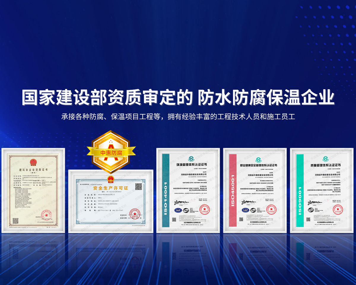 公司經營范圍:防水防腐保溫工程;消防設施工程;建筑裝修裝飾工程;建筑機電安裝工程;電力工程;建筑工程;石油化工工程;工業清洗工程;油罐清洗工程;鋼結構工程;環保工程;模板腳手架工程;電纜防火封堵、防污閃噴涂、外墻外保溫工程;各類施工勞務作業;設備維修、船舶鉚焊、涂裝;電力工程材料、建材、防水材料、防火材料、防腐保溫材料銷售,并相繼通過了GB/T19001-2008idtISO9001:2008GB/T50430-2007質量管理體系認證證書。GB/T24001-2004idtISO14001:2004環境管理體系認證證書。GB/T28001-2011idtOHSAS18001:2007職業健康安全管理體系認證證書。公司是中國防腐蝕于防護協會、中國施工企業管理協會、電力協會和中國鋼結構防水協會會員單位。 公司的經營業務涵蓋了石油、化工、電力、冶金、煤炭、船舶、國防、燃氣、水利、環保、交通運輸、航空及國防軍工和輕紡市政等行業的防腐保溫絕熱設備。鋼結構安裝、防火、防水、金屬噴鍍、聚脲噴繪、陰極保護、防滲透堵漏、玻璃鋼及各種磚版材料襯里、橡膠襯里、煙氣硫和耐酸溶劑腐蝕等工程施工。公司連續十年榮獲“省市先進施工企業”“安全生產先進單位”“重合同,守信用企業”和“AA***資質企業”的稱號。2000年被命名為市級文明單位,2002年被國家工商行政管理局命名為“重合同,守信用的企業”、被中國工業防腐蝕技術協會命名為“防腐蝕企業,能源節約及環境保護領域有豐富的經驗和***的業績。工程一次交驗合格率100%。其中攀枝花鋼鐵公司煉鐵廠四號高爐及熱風爐防腐工程、上海寶鋼公司煤氣柜防腐工程、撫順石油一廠裝置防腐項目、齊魯石化公司稀烴廠高塔防腐工程、吉林化學工業公司煉油廠油罐防腐工程、天津石化熱電廠六號爐頂棚聯絡管保溫工程、大慶油田(太倉)力神泵業工程、中國化學工程第十一建設工程、中原油田勘探局工程、中國石化銷售有限公司華北分部、魯皖輸油管道工程、貴州開磷息烽合成氨工程、陜西黃陵煤化工程、中國石油天然氣西部管道塔里木輸油工程、邯鋼集團邯寶鋼鐵公司煉鐵工程、德州供電工程、吉寶(南通)船廠工程,偃師華潤熱力工程、鄭州熱力總公司。 河南省中惠防腐安裝有限公司愿以豐富的施工經驗,***的技術,***的設備,***的管理,***的服務,竭誠為國內外廣大的用戶提供***滿意、******的工程作品?! ∥夜驹概c國內外同仁一道,團結協作,共同推進防腐蝕行業發展! 公司地址:河南省長垣縣建設路北段360號 固定電話:0373-8866488 郵編:453400 網址:http://www_zhff_com_cn.susdun.com